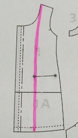 Má poměrně velkorysý výstřih, takže nebylo třeba ubírat na ramenních švech, ale upravila jsem pouze přední díl, růžová čára je nové místo střihu: