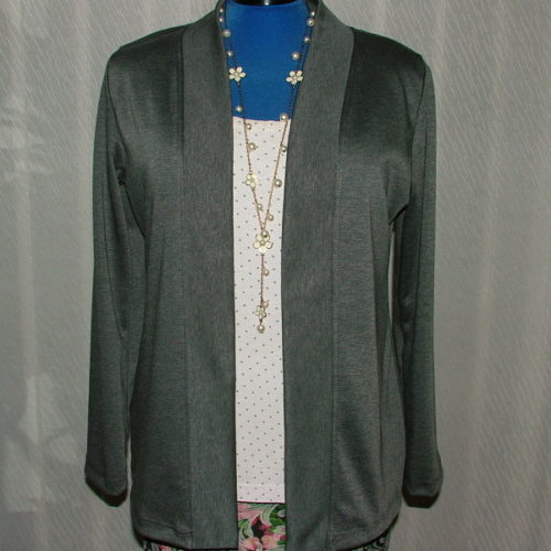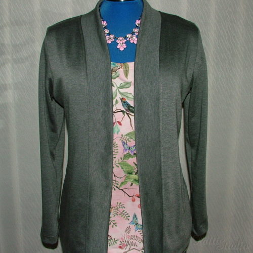 I za cenu zbytečně vynaloženého poštovného jsem se rozhodla potřebný kousek látky doobjednat, ale bohužel u dodavatele zrovna došly zásoby a ač obratem látku doskladnili, takže mi přišla velmi rychle, tak se bohužel jednalo o novou šarži a odstín neseděl. Nebyla to úplná katastrofa, prostě jsem místo légy délku založila, ale bez spodního lemu měl kardigan divnou, nelichotivou délku, takže jsem nakonec ještě 3 cm musela ustříhnout a vznikl kabátek v kratší délce.