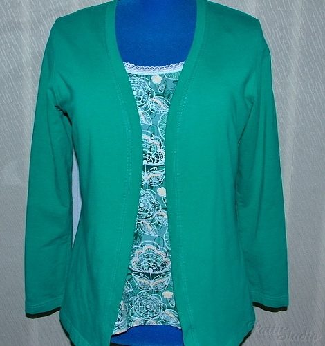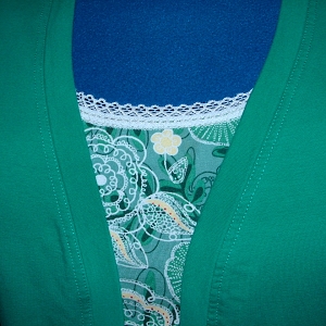 Z kardiganu se pak stal můj absolutně nejoblíbenější projekt a střih jsem potom reprodukovala ještě v dalších čtyřech nebo pěti variantách. Kardigan jsem šila ze smaragdové teplákoviny od Batani, a nemůžu si ho vynachválit, je na něm super úplně všechno: