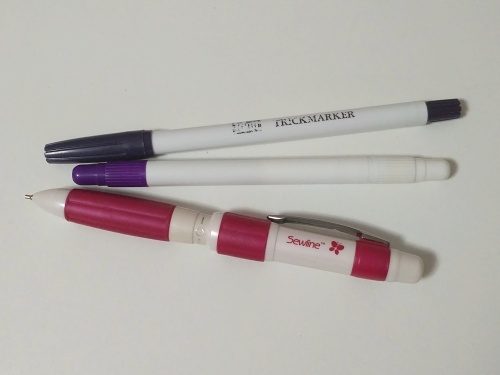 4 – Při šití určitě každá z nás používá krejčovskou křídu. Je levná, dostupná, snadno se z látky vypere nebo vypráší i během šití. Nevýhodou ale je, že čára křídou je dost tlustá, i když křídu zaříznete. Na světlé látky je proto výborná fialová tužka, kterou už teď dodává více různých výrobců. Jsou tužky jednoduché, dále tužky, které mají z jedné strany fialový hrot a z druhé růžový (každá barva má jinou dobu trvanlivosti) a také tužky s bílým zmizíkem. Ten je docela užitečný, když po šití nehodláte projekt před nošením prát. Já například tuto tužku používám pro označení umístění výšivek a když vyšívám na dodané materiály či oděvy, tak praní ani nepřipadá v úvahu. Jinak stopy fialové tužky se dají vyprat nebo odstranit jen navlhčením, na většině materiálů po čase zmizí i samy. Nicméně moje zkušenost je taková, že mizí přesně tak, jak já nepotřebuju;-) Několikrát už mi z bílé halenkoviny čáry zmizely ještě předtím, než jsem stihla vůbec stříhnout do látky. A naopak z bílého bavlněného plátna se samy neztratily ani po několika dnech. Pokud čáry přežehlíte, malinko se zafixují a drží déle, což se někdy může hodit a někdy právě naopak, takže pozor při rozžehlování švů nebo nažehlování výztuhy.