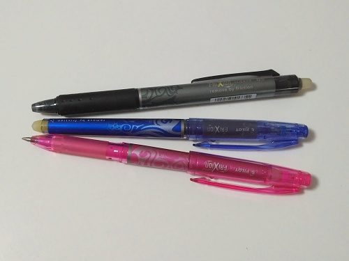 Výborným objevem posledních let jsou mazací /frikční/ pera. Moc ráda je používám na psaní, nemám ráda přeškrtané texty třeba v diáři, zbytečně mě ten zmatek plete, takže mazací pero, které zároveň píše hezky úhledně, tenkou linií, je super. Kdo tato pera neznáte, tak jen stručně uvedu, že jejich „zázračnost“ spočívá v tom, že inkoust je viditelný jen do určité teploty, při zahřátí se ztratí. Při gumování tím třením „gumy“ o papír, čilí frikcí, vznikne vyšší teplota, která způsobí, že inkoust zmizí. A toho lze právě skvěle využít při šití. Perem se na látku krásně kreslí, čára je tenká, takže lze zakreslit i sebemenší detail a potom stačí přežehlit a všechny čáry jsou pryč. Nicméně po vložení popsaného předmětu do mrazáku se inkoust zase objeví, tak přestože asi nikdo nestrká halenky do mrazničky, přece jen bych pero radila používat jen na drobné značky v okrajích střihových dílů, než na velkoplošné čmáranice.