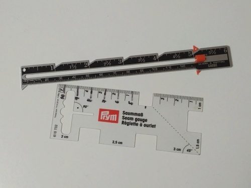 Mimo obyčejných pravítek lze využít i speciální šicí měřidla, jako jsou ta na obrázku. Černé pravítko na přídavky na švy je fajn i na odměření zakládané délky či rozměření knoflíkových dírek. Pro podobné účely lze použít i průsvitné plastové pravítko, které má výřezy v konkrétních délkách, které lze při stereotypních úkonech použít k odměření, aniž by bylo třeba sledovat přesnou stupnici.