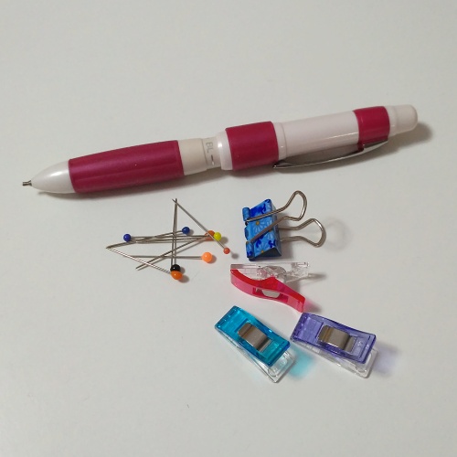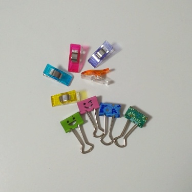 5 – Novinkou z poměrně nedávných dob jsou také malinké plastové svorky čili klipy na šití. Nedoporučuji kupovat imitace z Aliexpressu a podobných zdrojů, vyzkoušela jsem, nedrží dobře. Originály drží pevně a dobře se s nimi pracuje, pár si jich určitě pořiďte. Nejsou tedy úplně levné, proto při šití používám jako pomůcku také barevné kancelářské klipy. Cena je příznivá a jsou k dostání v různých velikostech a barvách. Skvěle drží i opravdu silnou vrstvu látky, takže jsou bezva třeba na quilty, patchworky, silné lemy u oděvů apod.