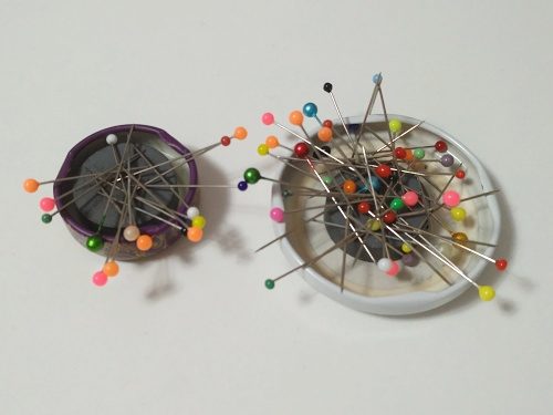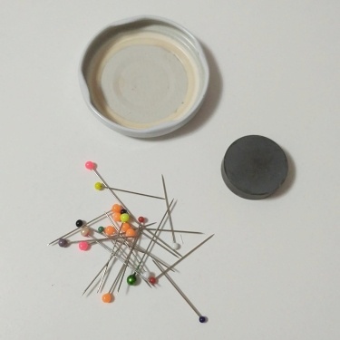 Ale potřebovala bych tak čtyři takové, mám špendlíky u šicího stroje, overlocku, coverlocku a na stříhacím stole. Tak jsem to vyřešila magnetem z papírnictví za tři koruny a víčkem od zavařovačky.