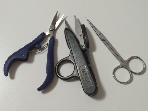 3 – Když jsem zmínila papír a kámen, nesmím zapomenout na nůžky:-) Nůžky jsou záležitost hrozně individuální, každému vyhovuje něco jiného. Klasické cvakačky zná asi každý, stojí pár korun a když jsou dobře utažené a nežvýkají nit, jsou na odstřihování fajn, mám jedny u každého stroje. Pro ty, kdo vyšívají, doporučuji zahnuté odstřihovací nůžky. Nedám dopustit na vynikající zahnuté nůžky od americké firmy Havel, které se bohužel tady nedají koupit a žádná z nabízených alternativ na českém trhu zatím jejich příhodného tvaru nedosahuje. Ale nedávno jsem vyzkoušela odstřihovací nůžky s modrou rukojetí, kupované u firmy NEDY, a pracuje se mi s nimi celkem dobře. Mají tedy opačný mechanismus než nůžky a jsou fajn opravdu jen na odstřihování nití, vystřihovat třeba malé tvary z látky je pohodlnější běžnými nůžkami, ale na odstřih nití při vyšívání (i šití) a potom na začištění výšivky z rubu jsou užitečné.