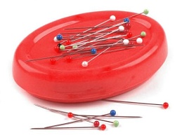 7 – Na závěr malinké DIY. Různé zásobníky nebo jehelníčky jsou k dispozici v široké nabídce, každý si vybere podle svých preferencí. Já osobě nemám ráda zapichovací jehelníčky, strašně mě to zapichování zdržuje, tak používám na špendlíky malou kovovou krabičku od bonbónů. Nedávno jsem ji při šití shodila a pak špendlíky sbírala z podlahy magnetem. Když jsem pak magnet i se špendlíky položila na stůl, uvědomila jsem si, že to vůbec není špatný nápad, takový magnetický zásobník na špendlíky. Zagooglila jsem a zjistila, že jsem neobjevila nic nového, něco takového se dávno prodává (zdroj: www.stoklasa.cz.)