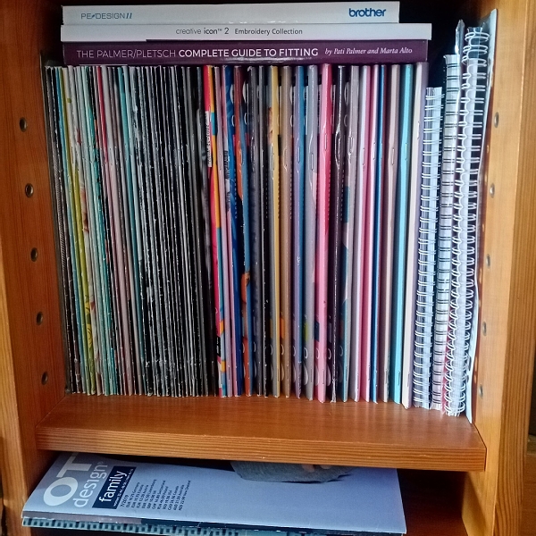 A ne, tohle samozřejmě není moje kompletní knihovnička Ottobre. Dětská čísla už nemám pro koho využívat, tak jsem jich část uklidila, aby se na ně neprášilo. Všimněte si, jak ochmataná jsou ta dámská čísla vlevo