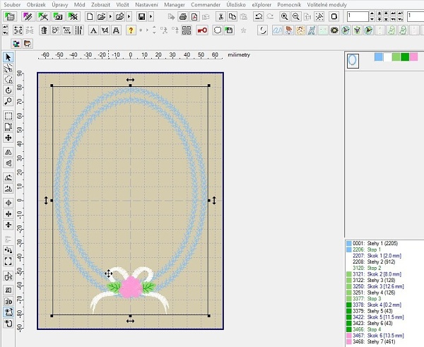 Ještě bych mohla objekty spojit do jednoho pomocí tlačítek Ctrl+A a Ctrl+Alt+I. Pro Brother PES toto spojení dělat nemusím, jednotlivé objekty se samy sloučí při ukládání (Embird se na to zeptá). Pro Pfaff VP3 se mi soubor uloží s takto oddělenými objekty a takto se i následně zobrazí ve stroji, což znamená, že stroj potom mezi oběma bílými barvami zbytečně zastaví. Takže záleží, jaký máte stroj a v jakém formátu ukládáte.