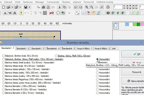, následně v okně, které se otevře, vyberete vhodný rámeček pro váš stroj: