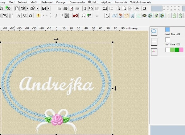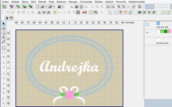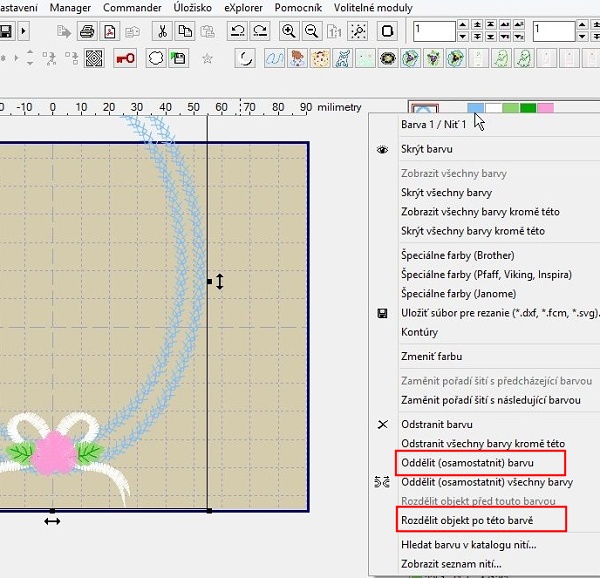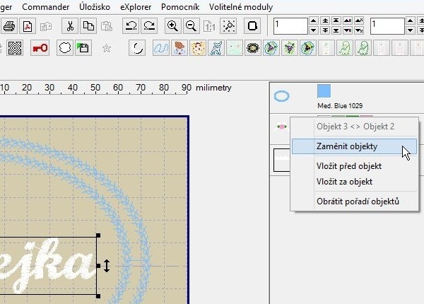 Ještě před vyšíváním si zkontrolujeme, zda máme inteligentně seřazené barvy. Já mám text a mašličku ve stejné barvě a jak je vidět vpravo v panelu, celkem zbytečně bych dvakrát měnila bílou nit. Protože se bílý text nevyšívá přes žádné jiné nitě, můžu klidně změnit pořadí šití. Takže buď kliknu v rámečku na text anebo v pravém panelu barev na poslední řádek s bílým čtverečkem a posunu ho myší nad druhý řádek a v zobrazené roletce zvolím příslušný pokyn – tedy buď Zaměnit objekty nebo Vložit před objekt.