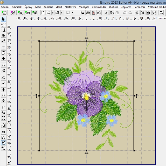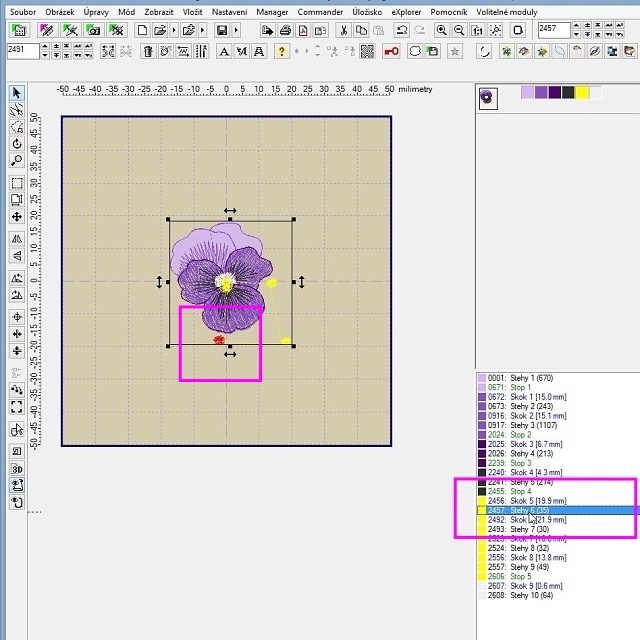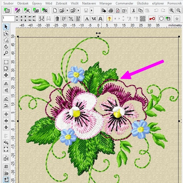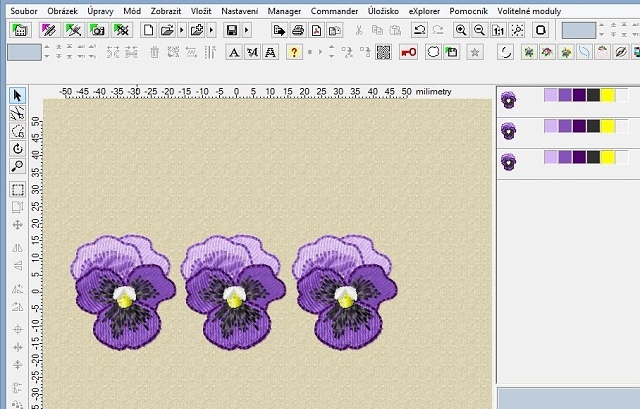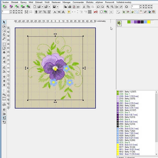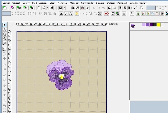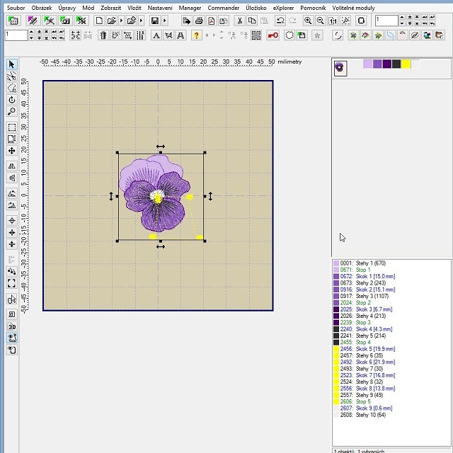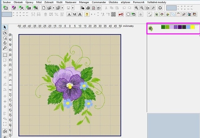Takto jednoduše jsme si z komplexního designu vypreparovali jen jeho část, kterou si teď můžeme poslat do stroje a vyšít, případně s ní dále pracovat, například pokud jich chceme vyšít více do bordury, můžeme si macešku mírně otočit, aby byla rovně, pak duplikovat do bordury nebo třeba do rohového vzoru. Pak se bude hodit návod na kumulaci barev z článku Embird tipy #1.