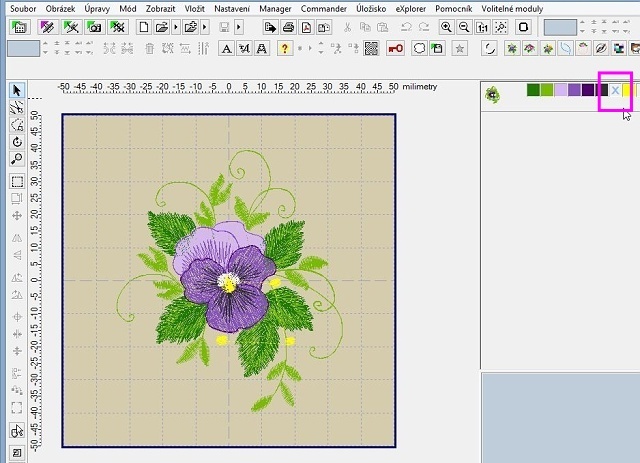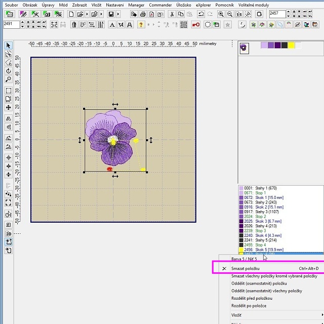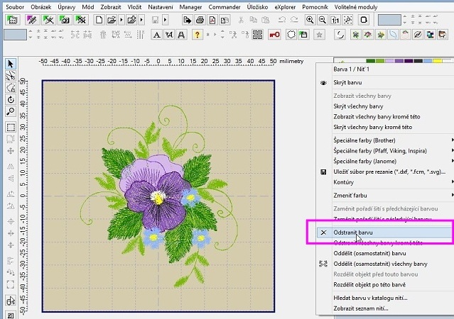 Vidíme, že maceška je celá, žádná její část nechybí, takže je možné ji vyšít samostatně. Smažeme si tedy barvy, které vyšívat nechceme. A dělá se to jednoduše opět kliknutím na ikonku barvy v pravém panelu, tentokrát klikáme pravým tlačítkem, to nám rozbalí roletu s pokyny, kde si zvolíme Odstranit barvu.