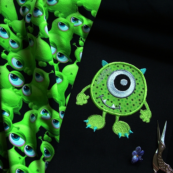 Když se vám podaří najít příšerkovský potisk s podobným motivem, dá se aplikace velmi originálně kombinovat. Já se chystám na tričko. Potištěný jednolíc jsem si ulovila na e-shopu Barevné šití.