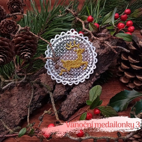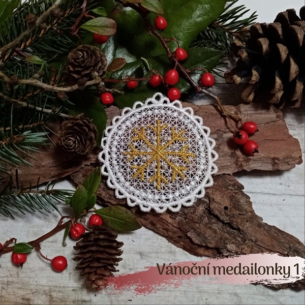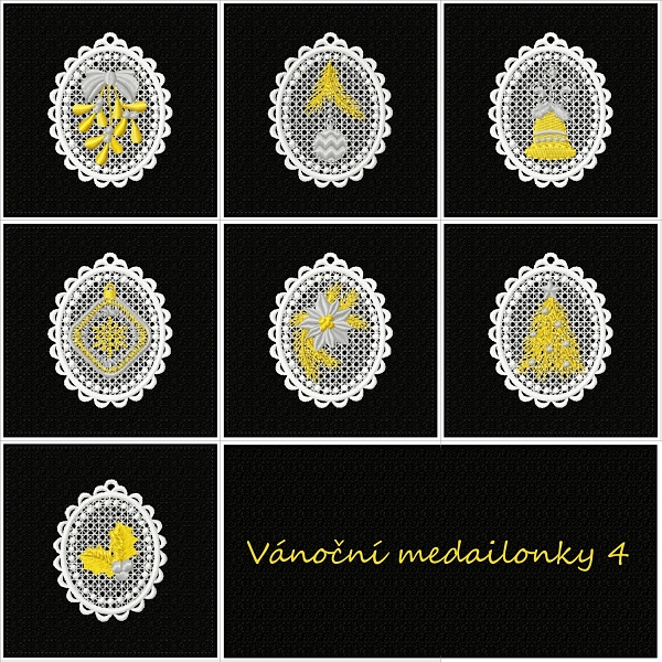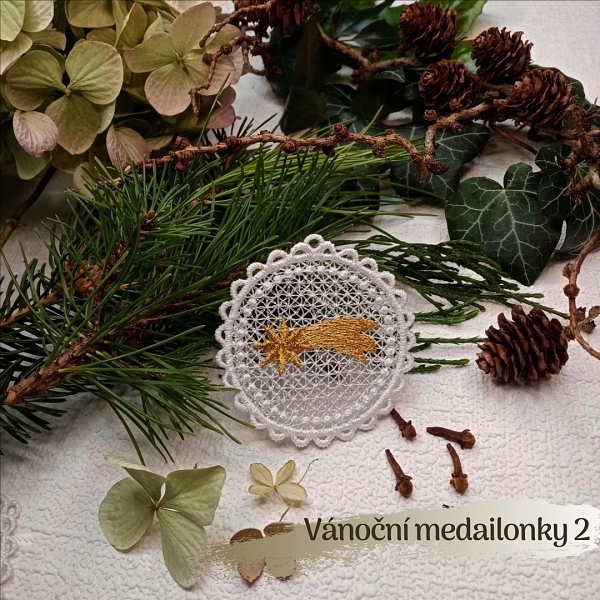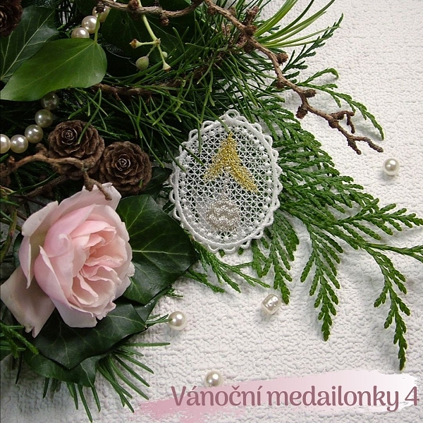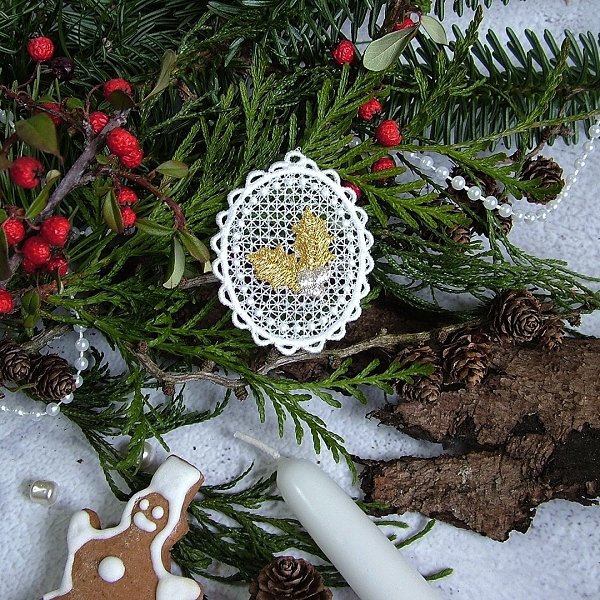 Je to sada šesti drobných oválných krajkových motivů, díky jejichž menší velikosti se tyto motivy hodí i na drobnější vánoční stromečky či různé kytice a aranžmá z větví. Kromě toho používám tyto motivy i na adventní věnce, vánoční dekorace či závěsy nebo třeba jako dozdobení originálně balených dárků či na vytvoření přáníček.