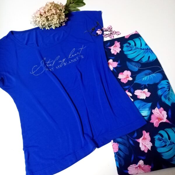 Někdy se to syslení holt vyplatí;-) Jsem z ní nadšená, krásně se kombinuje s trikem z nádherně modré viskózy z Batani.cz, k tomu pudrově růžová kabelka a podle příležitosti tenisky nebo sandálky.