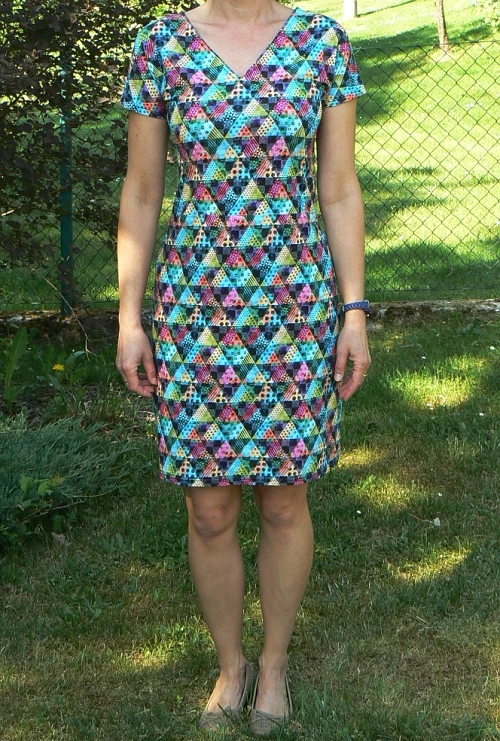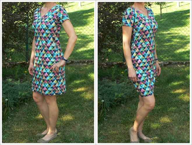 První variantu šatů šila kamarádka, které na rozdíl ode mne nemá nadměrné zásoby látek a vybírala látku cíleně pro tento střih jednoduše u ověřeného zdroje;-). Bohužel látka už je vyprodaná, a to ani na snímku nevypadá tak dobře, jako ve skutečnosti, kdy jsou jednotlivé barvy mnohem výraznější, živější.