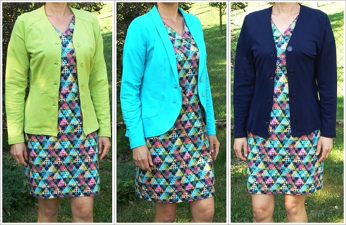Jednotlivé barvy na látce jsou krásně výrazné a hodí se k ušitým kardiganům z hráškové, tyrkysové a tmavě modré teplákoviny.