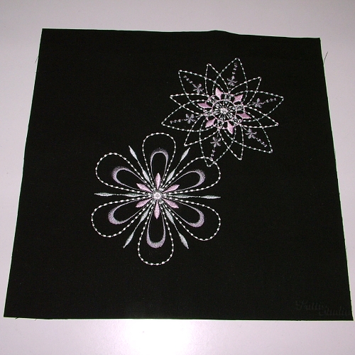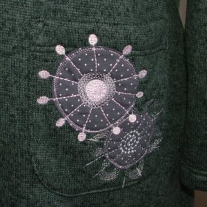 Ale pak začala má vyšívací klasika (už jsem ji popisovala v článku o Nikki kardiganu). No prostě – když mám vyšívací stroj, tak žádné oblečení nevyvázne jen tak, vždycky se najde nějaká výšivka, která se na něj hodí. Měla jsem představu něčeho vzdušného, moderního, neutrálního, žádné romantické kytičky a kraječky. Tak třeba oblíbené mandaly, ty se hodí všude. Ale výšivky z první kolekce byly moc komplexní, husté, chtělo by to něco lehčího. Nadějněji vypadaly radiální mandaly z připravované kolekce (která je nyní už na světě). Testovací výšivka dopadla dobře: