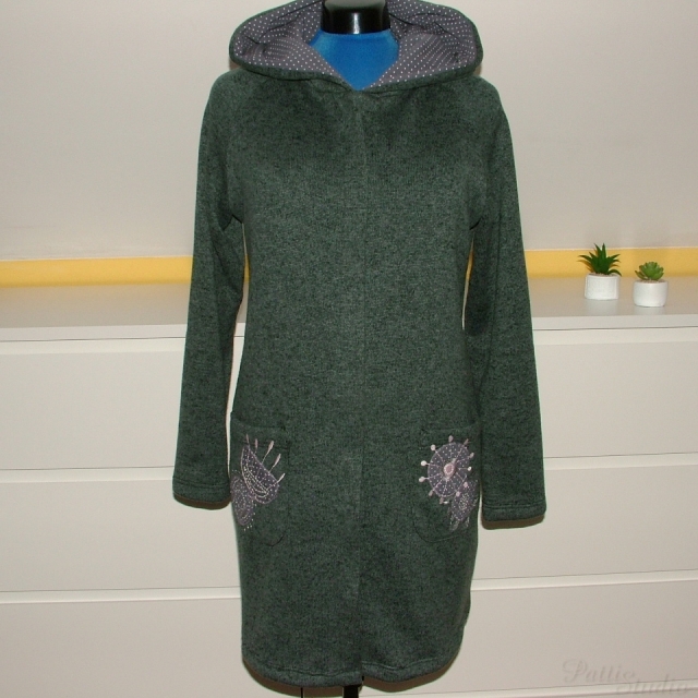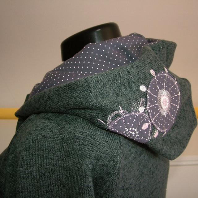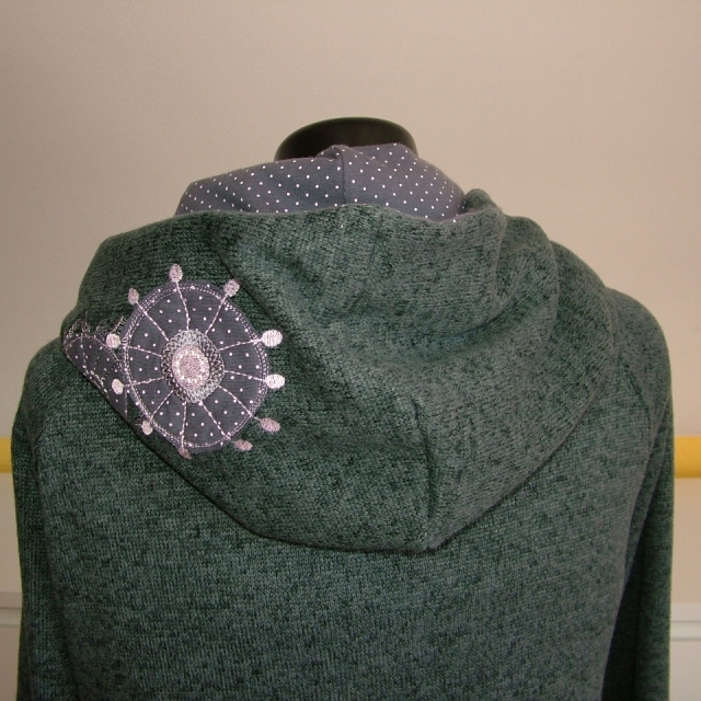 A aby tam byl nějaký spojovací prvek, tak mi přišlo, že puntíkovaný úplet by byl super na vypodšívkování kapuce. Nápad skvělý, jeho provedení ovšem opět trochu protáhlo realizaci celého projektu. Zvlášť když se pak vzor na kapsách zdá být až moc daleko od kapuce, takže látka jako spojovací prvek moc nefungovala. Nevadí, šup ještě dvě výšivky na kapuci. Další zdržení. Ale výsledný efekt za to myslím stojí.