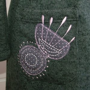 Jenže našít je jen tak na svetrovinu nešlo, chtělo to podložení, jinak by se brzy z pleteniny trhaly. A do takové piplačky se mi vůbec nechtělo. Tak kabátek pořád visel v mém šicím útočišti na Elišce (to je moje krejčovská panna) a já jsem pořád promýšlela nejlepší variantu.