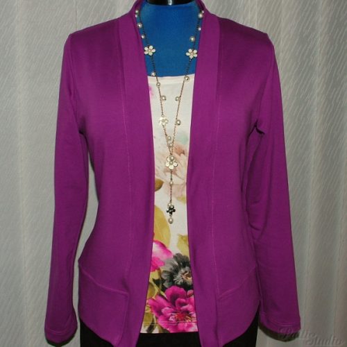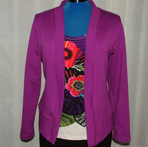 O druhém kardiganu není moc co psát, je prakticky totožný, jako ten předchozí, jen o malinko kratší a přední díly byly ještě o něco zmenšeny, aby byl kardigan více otevřený. Šila jsem ze své oblíbené teplákoviny z Batani, a ač obsahuje příjemných 5% elastanu, tak je znát, že oproti Ponte Roma má látka zcela jinou strukturu a jinak se chová, takže by asi bylo bývalo lepší, kdybych na předním díle neubírala. Ale možná je to jen o zvyku, že mám tendenci se do kardiganu pořád „balit“. Ovšem krásně výrazná ostružinová barva, přesněji odstín magenta, povýšila kabátek o level výš oproti jeho předchůdci.