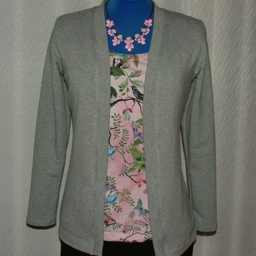 Třetí kardigan není pro mne, ale pro kamarádku. Tedy původně byl pro dceru, se kterou jsem výběr látky i střihu předem konzultovala, ovšem při první zkoušce můj drahoušek nad produktem ohrnul ret, že v TOMHLE ona nikdy chodit nebude. Tak jsem kabátek nabídla štíhlé kamarádce, které dětská velikost 164-170 sedí, takže moje práce naštěstí nepřijde vniveč. Střih byl inspirován kardiganem z Ottobre 4/2011 (které je bohužel již definitivně vyprodané), ale ve výsledku je po úpravách vlastně hodně podobný Blackwood kardiganu, jen nemá dole lem. Materiál je opět oblíbená elastická teplákovina z Batani.