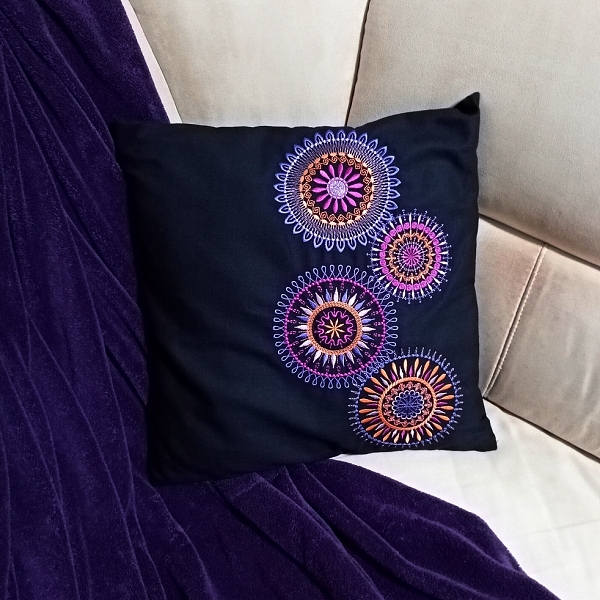 A to ještě jen proto, že jsem měla na stříhacím stole pořád položený vyšitý panel s mandalami ještě z doby, kdy jsem testovala sadu velkých mandal pro rámeček 18×13, takže stříhnout k tomu druhý panel, přišít zip a sešít dva čtverce, to už byla skutečně jen otázka chvilky. Mimochodem, o mém oblíbeném způsobu všívání zipu do polštáře jsem psala tady a díky němu je teď (alespoň pro mne) šití polštáře opravdu záležitost na 10 minut.