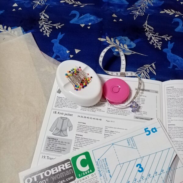 Až teď jsem vytáhla dlouho odloženou teplákovinu s labutěmi z de-park. Už ani nevím, s jakým záměrem jsem ji vloni kupovala, byl jí jen metr, tak jsem ji asi chtěla do kombinace s jednobarevkou na nějakou mikinu. Ale teď jsem před očima úplně viděla krátký kabátek s 3/4 rukávem, něco ve stylu mého loňského kabátku Ornament z Ottobre 2/2015 (pro případné tazatelky musím bohužel říct, že toto číslo už je definitivně vyprodané). Chtěla jsem ale vyzkoušet úpletový kabátek ze starého dobrého Ottobre 2/2006, se kterým mám plány už dávno, a teď právě přišla vhodná doba.