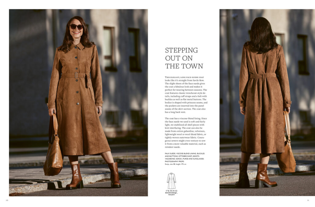 , a můžu si objednat broušenou kůži dokonce v různých provedeních, takže kabát ani nebudu muset podšívat, když se mi nebude chtít. Střih ale s podšívkou počítá, takže umožňuje využít spoustu materiálů – tenké plášťovky, micropeach, gabardény, lehké vlněné látky aj.