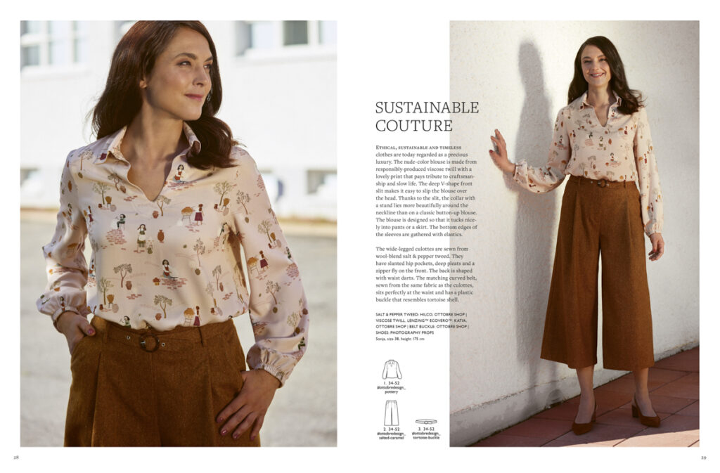 Pokud si na šaty nepotrpíte, ale do práce potřebujete něco trochu víc „hóch“ než tričko nebo mikinu, tak se možná bude hodit střih na halenku a k ní případně i stále ještě módní široké kalhoty „culottes“: