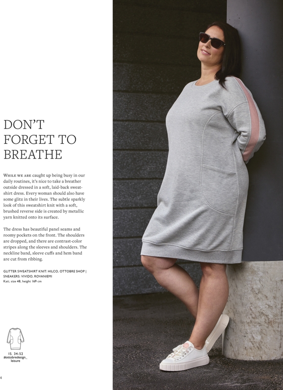 . Není nic depresívnějšího, než vrátit se po svátcích do práce, za okny šeď, do jara daleko a ještě člověka škrtí oblečení! Dokážu si představit namísto šedé teplákoviny použít na šití jinou barvu, nebo třeba jiný elastický materiál, například punto, dá se vynechat spodní lem a prodloužit délka, třeba i vynechat kapsy, přidat brož, náhradelník nebo šátek a rázem z vyloženě sportovně laděného střihu můžou být top elegantní šaty.