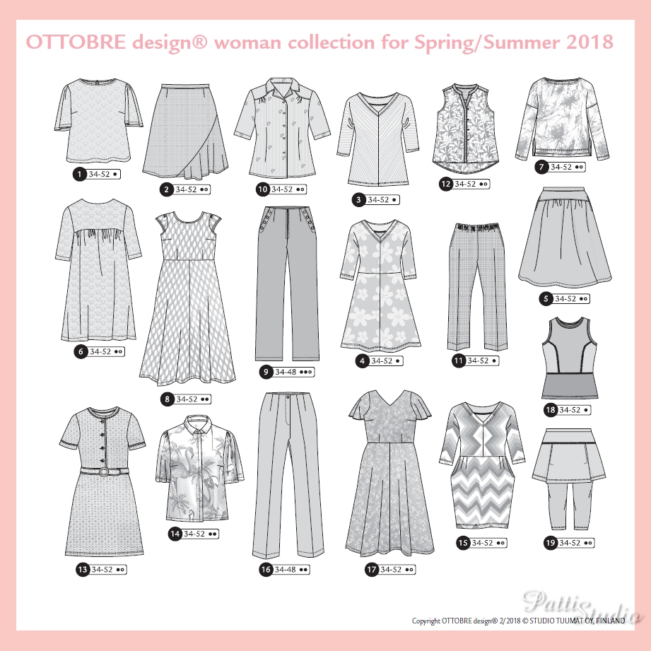V tomto čísle naleznete 19 modelů, opět ve velikostech 34-52. Kdo již střihy Ottobre znáte, jistě víte, jak dobře se pracuje s jejich střihovými přílohami, které jsou přehledné a tím, že jsou všechny velikosti každého střihového dílu zakresleny na jednom místě, dá se krásně při vykreslování střihu z přílohy přizpůsobit velikost individuálním požadavkům, například vybrat jinou velikost pasu oproti hornímu či spodnímu obvodu.
