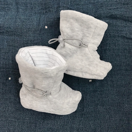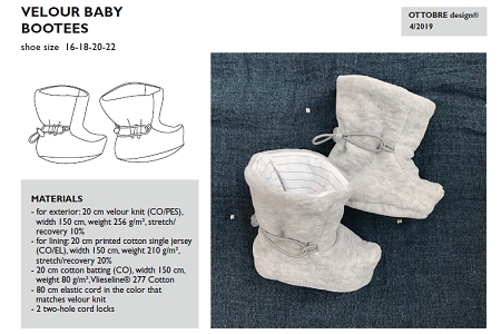 Botičky jsou vhodné pro miminka do kočárku, případně dle teplot a použitého materiálu i do šátku. Prezentovaný model je ušitý z kojeneckého plyše, vnitřní vrstva je z elastického jednolíce, zateplený je bavlněným vatelínem. Použít by šel určitě i fleece a jeho různě chlupaté varianty jako wellsoft, coral fleece nebo také warmkeeper či počesaná teplákovina. Efektně budou huculky vypadat z broušené umělé kůže s beránkem, kde si lze pohrát s detaily, například přiznat švy do líce a přidat horní ohrnutý lem.