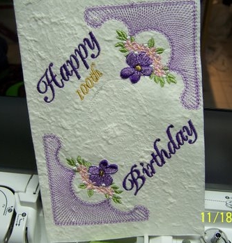 Obrázek níže je ukázkou toho, že vyšívat se nemusí jen na látku. Vzor z kolekce Fialky 3 vyšila na speciální ruční papír jedna z mých zahraničních zákaznic a vytvořila originální přání k neuvěřitelným 100. narozeninám! Z takové zaslané fotografie mám dvojnásobnou radost.