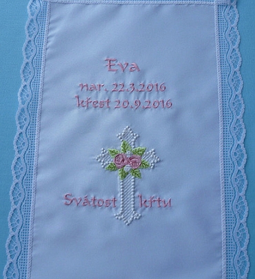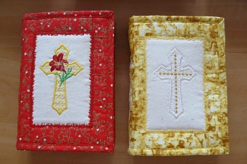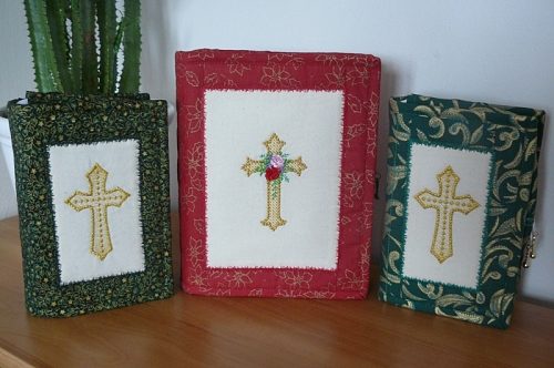 Další velmi oblíbenou sadou jsou Kříže. V e-shopu jsou dispozici zatím dvě sady, třetí bude doplněna v nejbližších dnech. Tyto výšivky používám na své křestní roušky a stejně je používají i mé zákaznice, ale dostala jsem také fotky krásných šitých obalů na bible, a to je tedy hodně velká paráda: