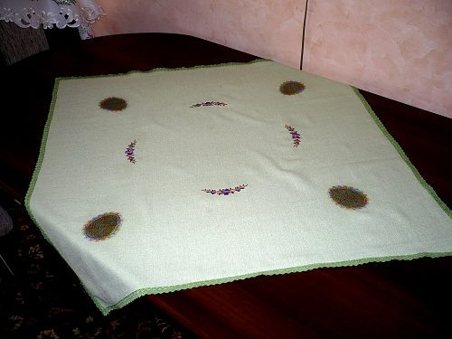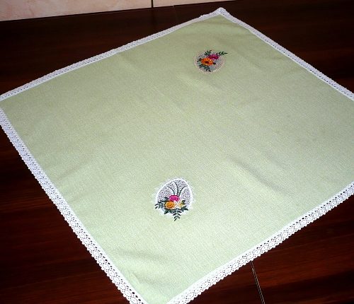Na závěr něco tématického k blížícím se Velikonocům – ubrusy s krajkovými vsadkami ve tvaru vajíček, zdobené květinami: