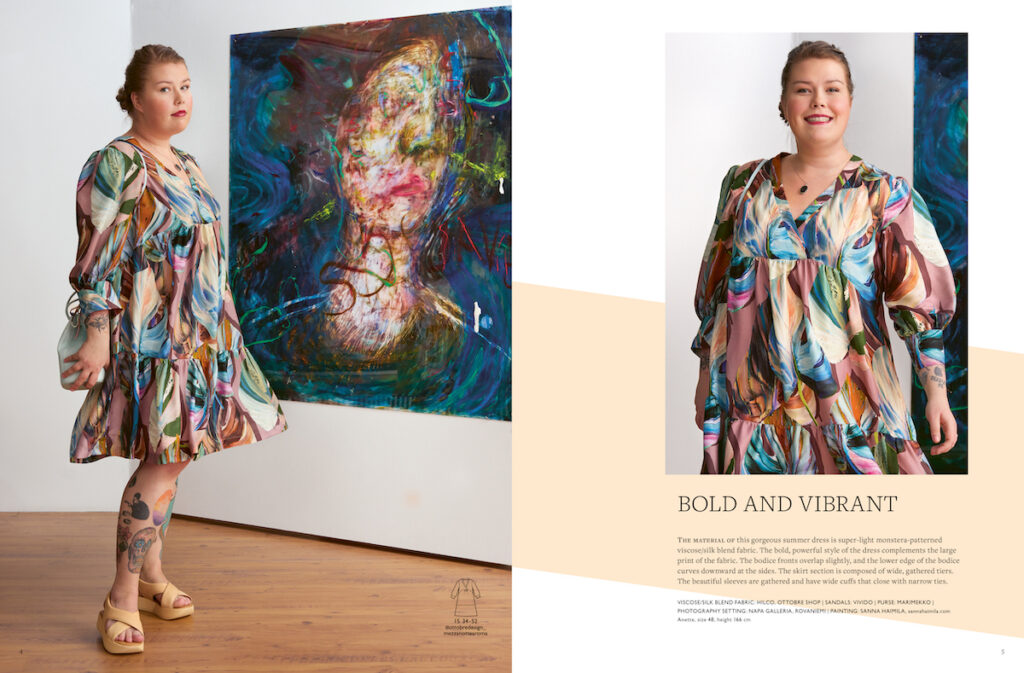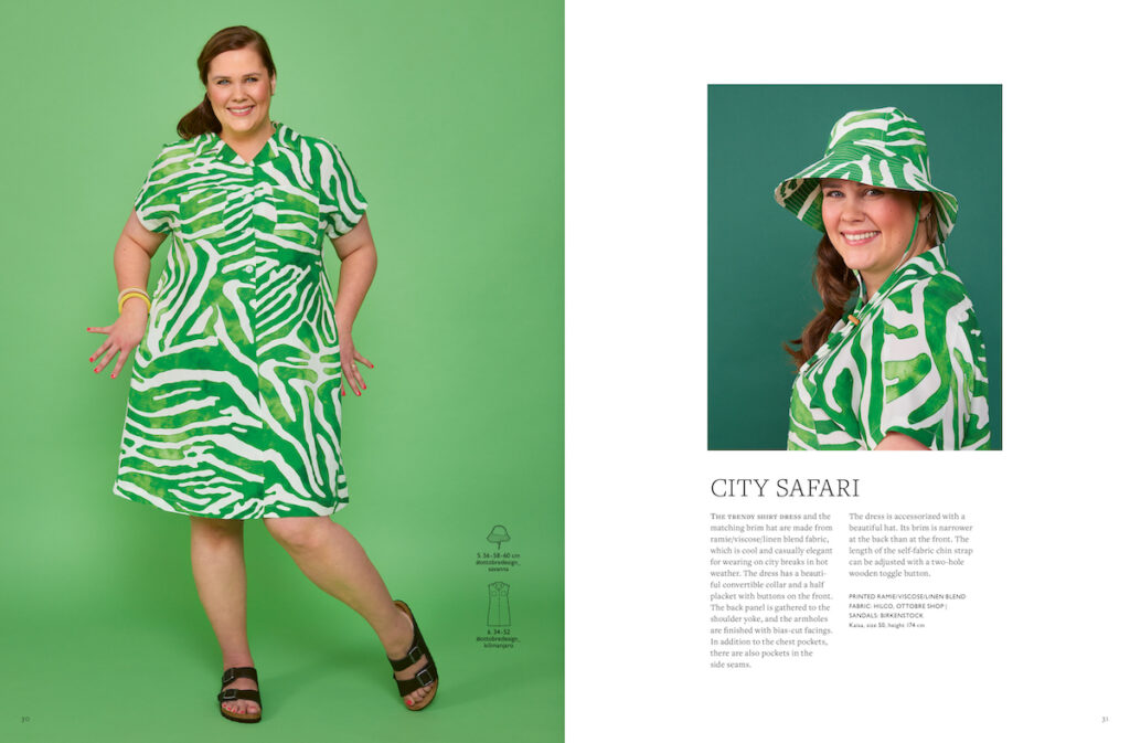 Stejně výraznou látku, jen v zeleném provedení, vidíme i na následujících šatech a klobouku. Košilové šaty vycházejí ze střihu na popelínovou halenku ze strany 27. Mají propínání do pasu, dál jsou sešité. V bočních švech jsou kapsy. Použitý materiál je směsovka ramie/viskóza/len, což je na léto skvělá kombinace. Velikost střihů: 34-52, modelka má velikost 50. Šaty doplňuje klobouk s širší krempou ze stejné látky, který se bude hodit na pláž i do rozpáleného města. Aby ve větru neuletěl, má všité šňůrky, které se stahují dřevěným knoflíkem se dvěma dírkami, který lze nahradit klasickou brzdičkou. Střih je pro obvod hlavy 56-60 cm.