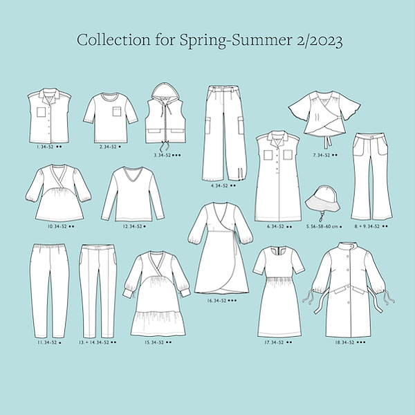 A teď už k modelům. Jejich přehled působní na první pohled trochu chudobně, jako by jich bylo méně než obvykle, ale je jich 16, z toho dvoje kalhoty jsou pod dvěma čísly rozdělené do dvou velikostních škál, takže konečné číslo je 18. Já úplně toto rozdělení nemám ráda, ale dělo se to i v předchozích číslech, takže to není vyloženě novinka.