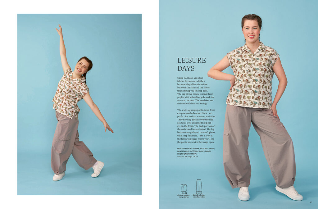 Dalšími dvěma modely jsou kalhoty a zavinovací halenka. Ta je ušitá z potištěného viskózového krepu, který je prodyšný a příjemný na dotek. Halenka se zavinuje pomocí vázaček našitých na okraje předních dílů. Ty jsou zřaseny do malých ramenních sedel. Sedlo je i na zadním díle. Rukávy do zvonu jsou zakončeny rolovacím lemem.