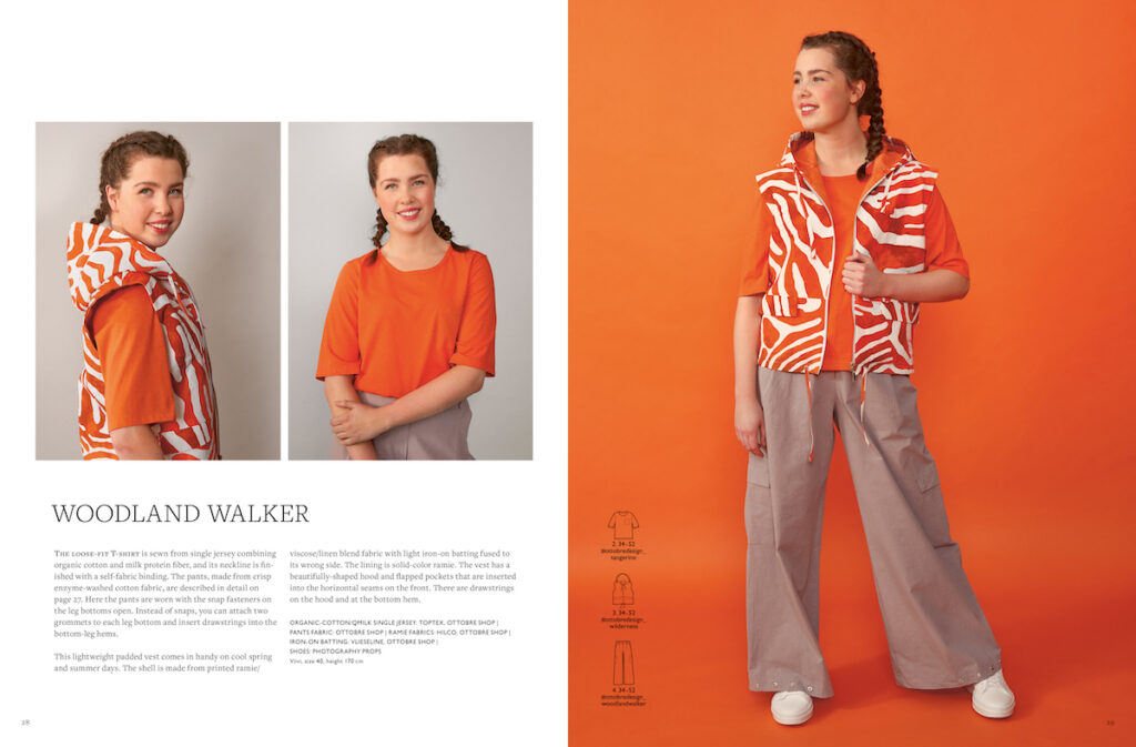 Lehká prošívaná vesta se bude hodit na jaře i v létě. Na vrchní vrstvu a podšívku byla zvolena látka ramie, což je tkanina z tzv. čínské trávy, která má vlastnosti podobné lnu. Mezivrstvu tvoří nažehlovací vatelín. Vesta je v linii pasu přestřižená, v prostřihu jsou umístěné kapsy s patkou. Kapuce je originálně tvarovaná, takže hezky leží na ramenou a netáhne celou vestu dozadu. V okraji kapuce je stahovací šitá šňůrka, která je také v dolním okraji vesty. Modelka má velikost 40, všechny modely jsou v rozsahu velikostí 34-52.