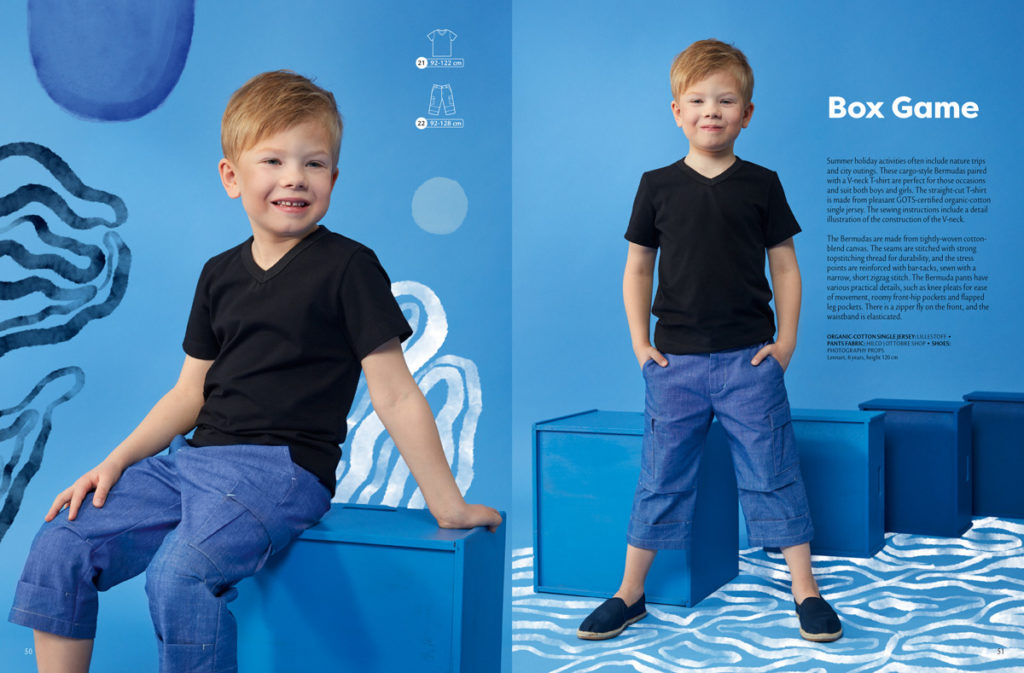 Klasické tričko s výstřihem do „V“ se hodí pro kluky i holky, základní střih lze do nekonečna obměňovat použitím různých potisků na úpletech nebo využít zbytky pro color-blocking. Velikosti: 92-122. Bermudy jsou ušity ze směsového, hustě tkaného plátna. Jsou prošity silnou kontrastní nití a mají spoustu promyšlených detailů, například sklady na kolenou, které poskytují dostatečnou volnost při pohybu, nebo dva páry prostorných kapes. Jsou všity do pásku s gumou, mají klasický poklopec. Velikost: 92-128.