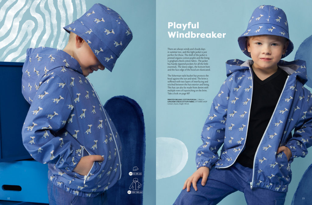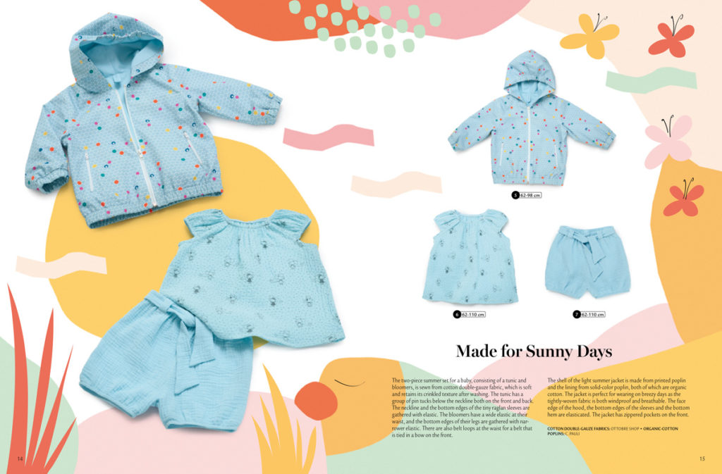 Pro nejmenší jsou určeny i kraťásky a tunička z bavlněné gázoviny (mušelínu). Velikosti: 62-110. Lehká bundička je ušita z potištěného popelínu a podšitá lehkým jednobarevným popelínem, obojí z organické bavlny. Nahusto tkaný popelín je skvělý jako horní vrstva při větrných dnech, protože látka je méně propustná vůči proudění vzduchu, přitom stále prodyšná. Velikosti: 62-98.
