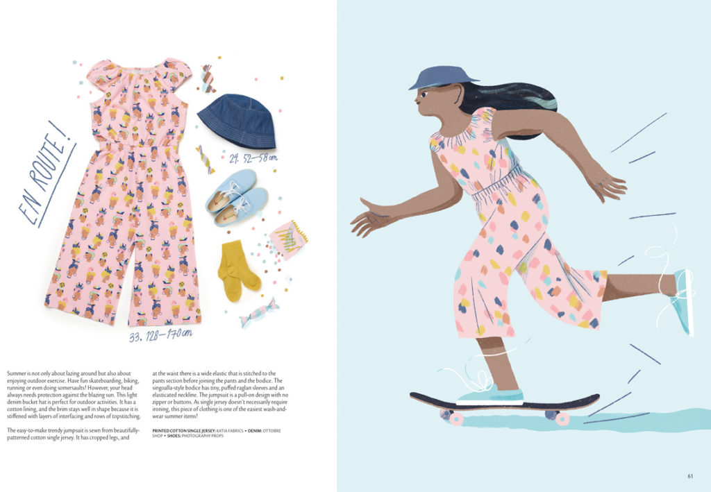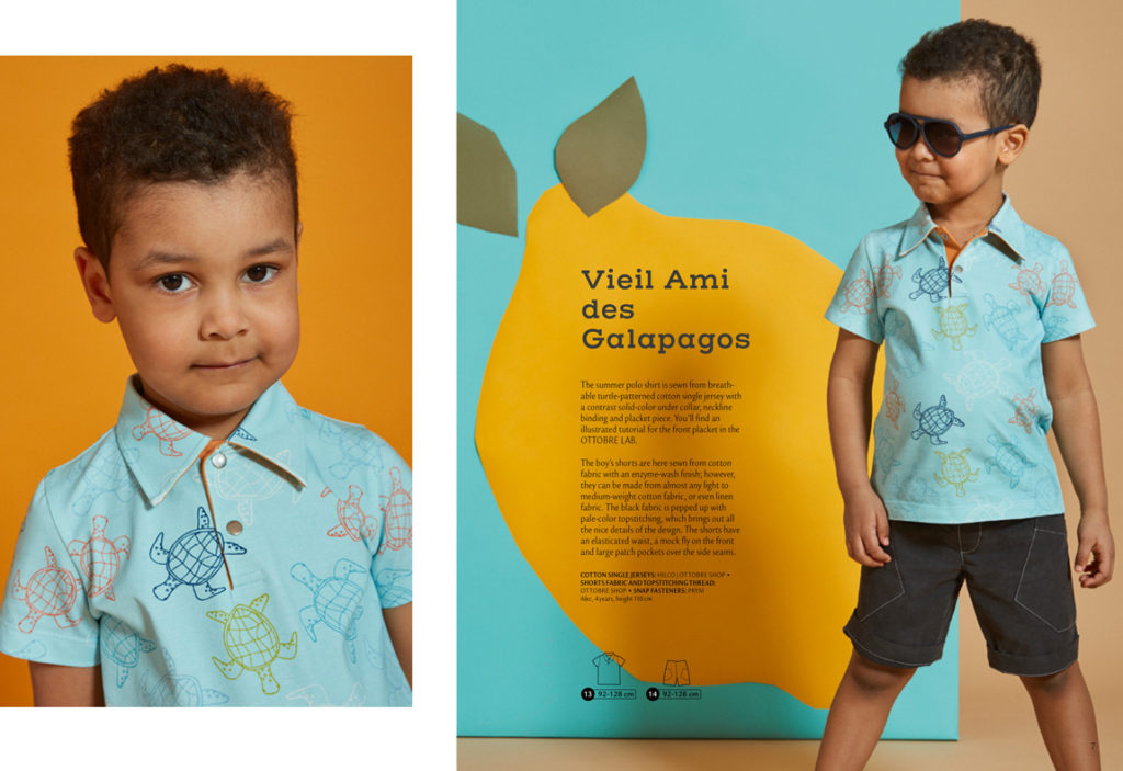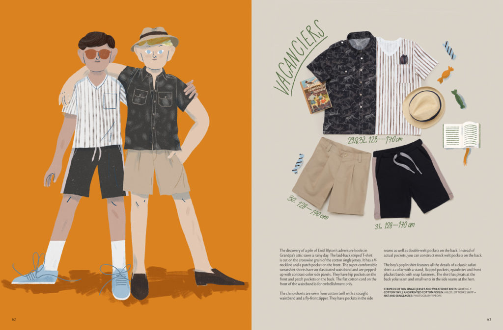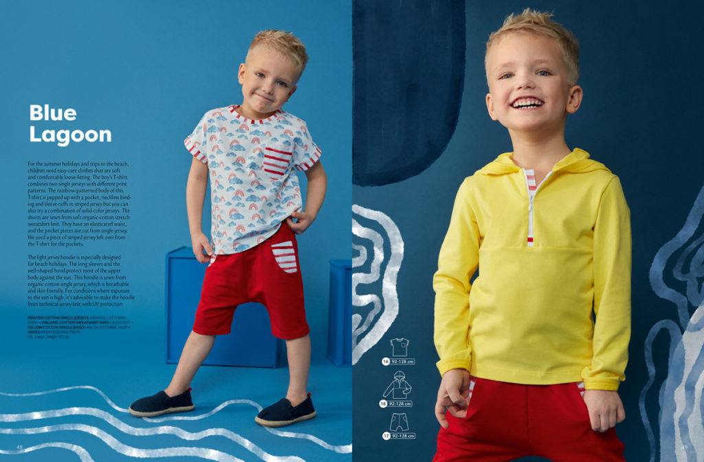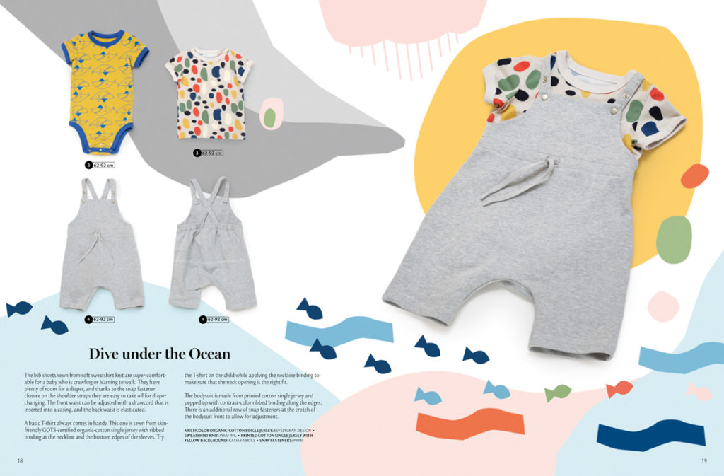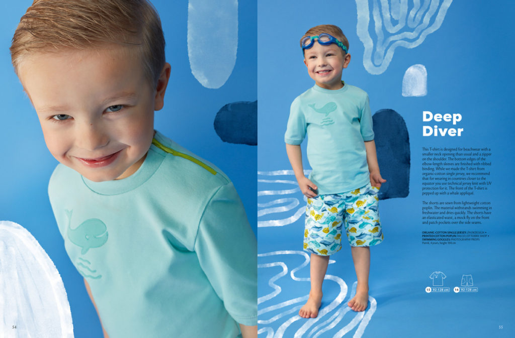 Na další straně se znovu objevují plátěné šortky z předchozích stran, tentokrát ušité z typicky letního potištěného popelínu. Doplňuje je tričko ke krku s kontrastním zipem všitým v ramenním švu. Přední díl je zdobený rybičkovou aplikací, která doplňuje potisk na šortkách. Velikosti: 92-128.