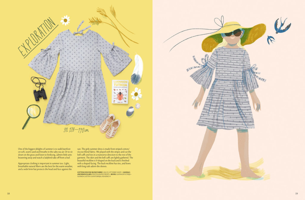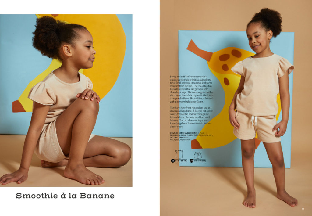 Šortky se opakují potřetí, tentokrát v provedení pro holčičky z jasně žlutého bavlněného twillu (připomíná denim). Rozzářenou sluníčkovou barvu doplňuje sluníčková aplikace na tričku (šablona k překreslení je rovněž na poslední straně šicích instrukcí). Triko má na ramenou zapínání na druky. Ze stejného střihu vycházejí i šaty z titulní strany, které vtipně kombinují dvě varianty proužkovaného úpletu. Mají správně letní námořnický look! Velikosti trička a šatů: 98-128.