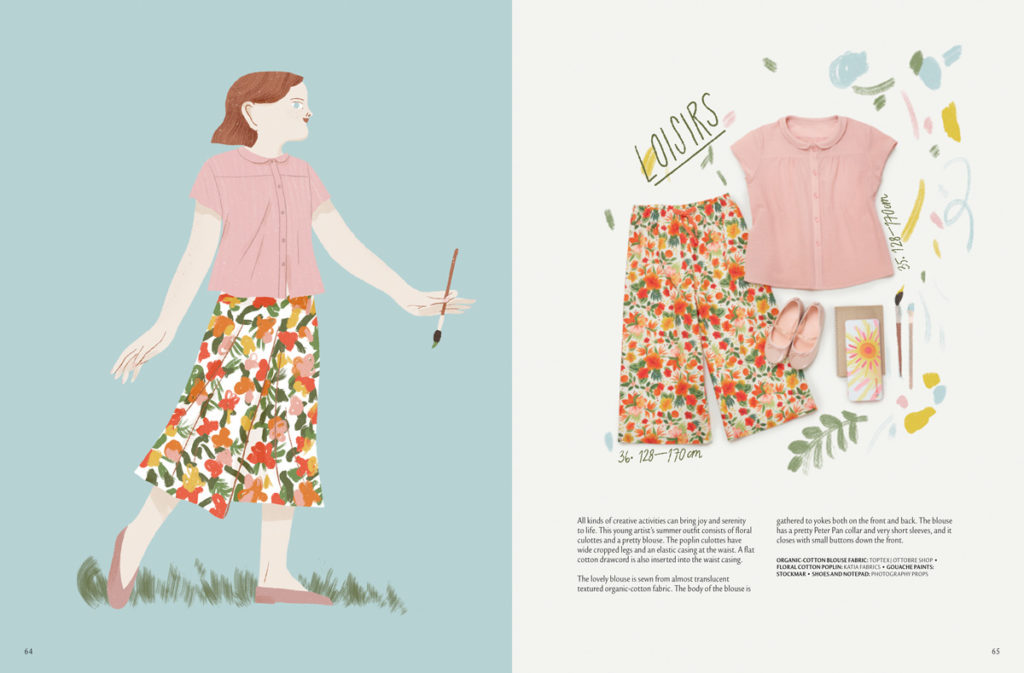 Letní Ottobre uzavírají poslední dva modely pro dívky: kalhoty „culottes“, které jsou od minulého roku velmi trendy, zde v provedení z potištěného popelínu s pohodlnou gumou v pase, doplněné roztomilou halenkou s kulatým minilímečkem (momentálně hodně populární záležitost), krátkým rukávkem a předním i zadním dílem řaseným do sedla. Halenka je ušitá rovněž z jemného popelínu, tentokrát bez potisku, zato s texturou. Oba modely ve velikostech 128-170.