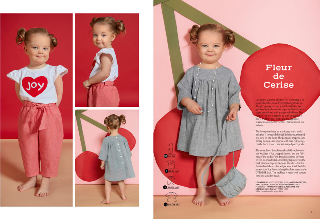 Přehlídka modelů začíná minikolekcí pro menší holčičky: lněné šatičky a kalhoty, tričko z organické bavlny a k tomu kabelka pro malou parádnici. Len je oblíbeným letním materiálem, takže byl pro toto období logickou volbou. Modely jsou volné a vzdušné. Tričko má řasený rukávek, dolní okraj je začištěn rolovaným lemem. Přední díl je zdobený aplikací. Šablona na aplikaci je k obkreslení na poslední straně šicích instrukcí uvnitř časopisu. Velikost: 62-92. Kalhoty mají v pase gumu a v poutkách provlečenou vázačku. Délka je zkrácená, na zadním díle je zdobná srdíčková kapsa. Šatičky mají zkrácené rukávy, přední i zadní díl jsou zřaseny do ssedla. Vzadu je zapínání na knoflíky, vepředu srdíčkové kapsy. Velikosti: 92-128. Střih na taštičku si můžete stáhnout kliknutím SEM.