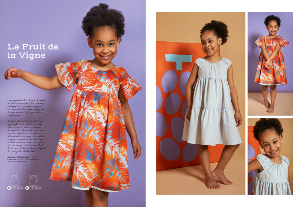 Na další stránce jsou dvě varianty šatů ve velikostech 110-146. Základ střihu je stejný. Jednobarevné jsou ušity z organického bavlněného popelínu, mají minirukávek zřasený gumičkou a dva volány. Barevné šatičky jsou z lehkého bavlněného voálu, sukně je tvořena jen jedním kanýrem, naopak mají bohatší rukávek, na kterém je z vnější strany našit řasený pás látky imitující kanýr.