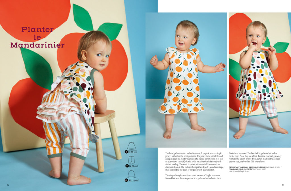 Další modely jsou určeny pro nejmenší děti. Jednoduchá tunika bez rukávů je mírně rozšířená, dole zdobená kanýrkem. Zadní díl je ve stylu klasických zástěrových střihů tvořen dvěma překrývajícími se díly, takže se tunika obejde bez zapínání, přitom je pohodlná na oblékání. Doplňují ji roztomilé kalhoty pod kolena s řadou volánků na zadečku. Druhé šaty mají rovněž na dolním okraji kanýrek a mají nabíraný mini-rukávek. Při jejich šití byly oproti původnímu střihu přidány navíc 4 cm na délku, jinak původní délka sahá po kolena. Velikosti: 62-98, šatičky až do 110.