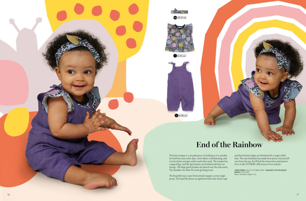 Na další straně se opakuje tričko s nabíranými rukávky, které už známe z úvodu časopisu v bílém provedení s aplikací. Tady je ušito z potištěného bio jednolíce. Velikost: 62-92. Střih na čelenku je ke stažení ZDE. Fialový overal ze lněné látky má mírně zkrácené nohavice a na bocích našité kapsy. Okraje jsou začištěny šikmým proužkem. Zavazování na ramenou poskytuje rezervu pro růst batolete. Velikost: 62-98.