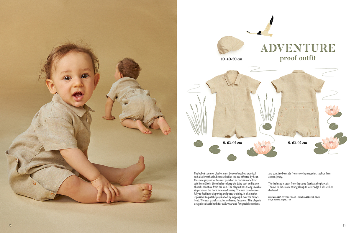 Pro malé lezce je i následující overal, opět z měkké lněné látky, která je na léto pohodlná, praktická a prodyšná, což je u malých dětí, u kterých hrozí přehřátí organismu, obzvlášť důležité. Navíc také saje pot. Overal má na zadečku originální odepínací panel pro snadné přebalování a na předním dílu skrytý zip pro pohodlnější oblékání. Model můžete ušít kromě lnu také třeba z pohodlného a příjemného popelínu, obě varianty budou vhodné pro běžné nošení i pro výjimečnější příležitosti, ale klidně můžete použít i elastický bavlněný úplet. Velikosti: 62-92.